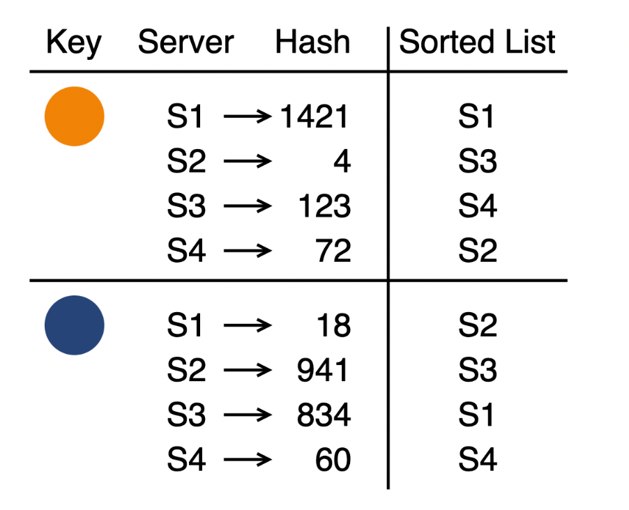 - We do this for all servers with the Key. Ex: Key + S1, Key + S2, Key + S3, Key + S4 combinations to get a list of hashed values. These values can be interpreted as numerical weights for each key