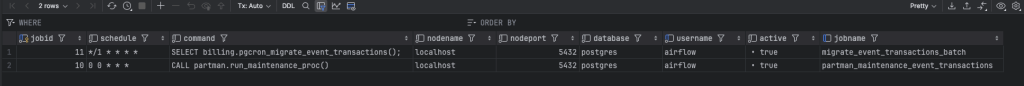 - Sets up maintenance job – Schedules daily pg_partman maintenance at midnight for partition management