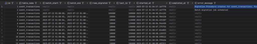 - Schedules batch migration job – Creates pg_cron job running every minute to migrate remaining data. You can check in your new database under the cron.job_details table for the list of runs.