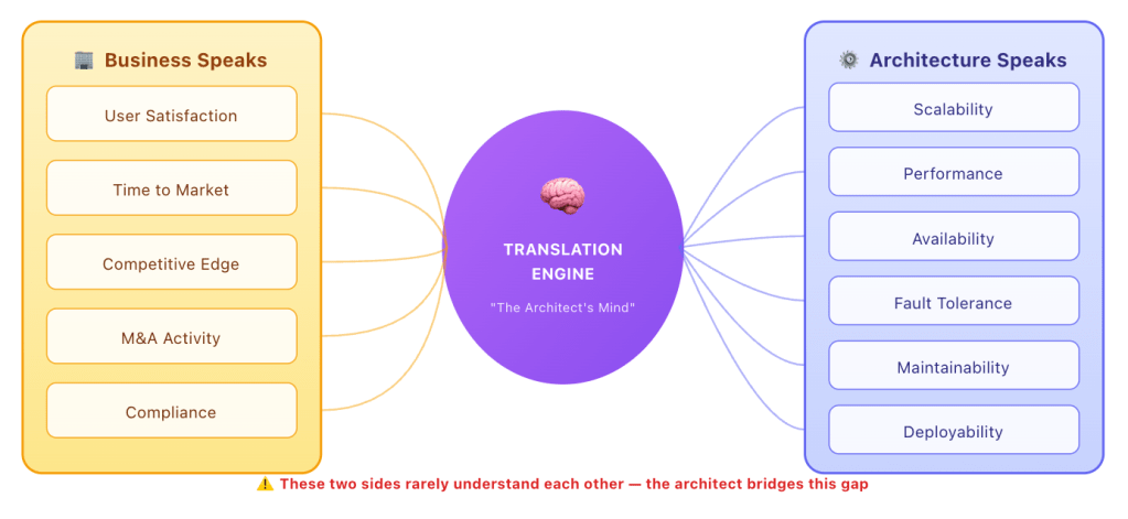 - Listening to the business — The most valuable source. When stakeholders articulate their priorities in plain language, the architect’s mental translation engine converts those words into the specific characteristics the system must support.